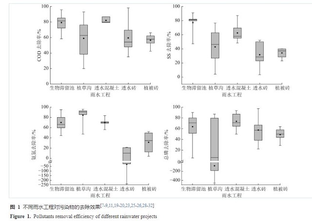 根據生物滯留池、植草溝、透水混凝土鋪裝、透水磚鋪裝和植被磚鋪裝5種雨水工程的實際監測結果,并綜合文獻報道,發現生物滯留池和透水混凝土具有較好的污染物去除效果,植草溝對于氨氮的去除具有獨特的優勢。植草溝的工程維護,特別是植被的生長情況,對于污染物的去除率有重要影響。若植被維護不善,不僅會影響其污染物去除效果,甚至會成為雨水污染的源頭。