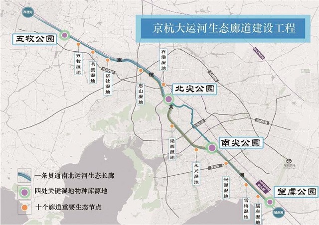 岸線全面覆綠、生態通道提質、水岸空間重構……明年底,通過生態廊道工程的建設,一條貫通南北運河的生態長廊將展現在世人面前。利用大運河的聯通性,這條綠帶上將構建起“一廊、四源、十節點”的空間布局。4個“物種庫”源地分別為五牧公園、北尖公園、南尖公園、望虞公園,它們是濕地鳥類的天堂、濕地魚類的樂園,能展現濕地凈化的魅力,又集運河植物的大觀。從五牧濕地到搖車濕地,由北向南如珍珠般鑲嵌其中的10個重要生態節點,將成為運河水生生物的暫棲地,為這道絕美風景錦上添花。