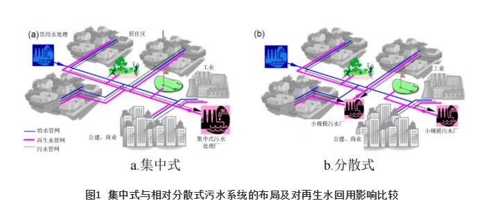 ①集中建設大規(guī)模污水處理系統(tǒng)具有較大的系統(tǒng)風險性,適度分散的污水處理系統(tǒng)不但提升了整個城市的排水系統(tǒng)總體韌性與可靠性,同時也有利于高品質再生水作為城市第二水源的就地短距離回用,也減少了污水收集管網(wǎng)多次提升及截污干管的工程量,避免了再生水遠距離泵送導致的巨量投資及運行的高能耗。集中式與相對分散式污水系統(tǒng)的布局及對再生水回用影響比較見圖1。