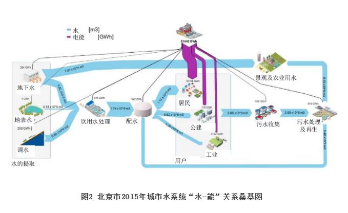 圖2所示給出了北京2015年水系統(tǒng)水量與能耗分配關系桑基圖,可以評估城市“水足跡”過程及能量消耗,在城市尺度上系統(tǒng)評估和多目標優(yōu)化“水-能”關系,通過水系統(tǒng)全流程過程系統(tǒng)規(guī)劃、聚焦水循環(huán)每個鏈條,進行傳統(tǒng)工藝改進、高效設備及革新性工藝技術應用,尤其是對排水系統(tǒng)結構優(yōu)化進而提升系統(tǒng)能源利用效率,因地制宜地采用污水中資源、能量回收以及清潔能源提取和利用等技術措施,進一步降低水系統(tǒng)能耗和溫室氣體排放,對于提升水系統(tǒng)韌性及可持續(xù)至關重要。