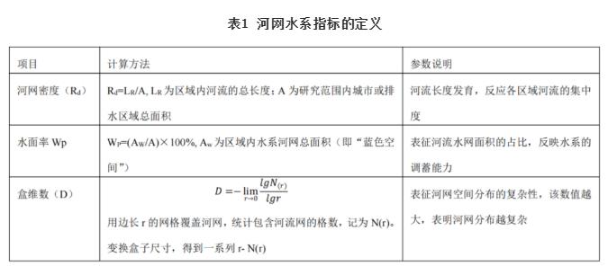 河網(wǎng)調(diào)蓄能力是水系在水文方面的重要功能之一,尤其在削減洪峰、降低洪水危害中具有重要的作用。受人類活動影響,尤其是近半個世紀年以來快速城鎮(zhèn)化引起的土地利用方式變化,致使許多城區(qū)河流、水塘、水淀區(qū)被掩埋甚至完全消失,導致城市水面率大幅減少,河網(wǎng)、水系發(fā)育及演變也表現(xiàn)出由復雜到簡單、由多元到單一的變化趨勢。世界范圍內(nèi)60%以上的河流受到城市化的影響,而城市化對河流生態(tài)完整性及生態(tài)功能造成了嚴重威脅;從國內(nèi)外經(jīng)驗看,這種演變無疑還會加劇洪澇災害、水質惡化等問題。借助河道容蓄指標與水系結構參數(shù)的相關關系分析河網(wǎng)結構對調(diào)蓄能力的影響,常用的水系變化指標包括數(shù)量特征參數(shù)和復雜性參數(shù),選取河網(wǎng)密度(Rd)、水面率(WP)描述水系的數(shù)量特征,河網(wǎng)盒維數(shù)描述水系的復雜性特征,各指標計算方法及內(nèi)涵見表1。