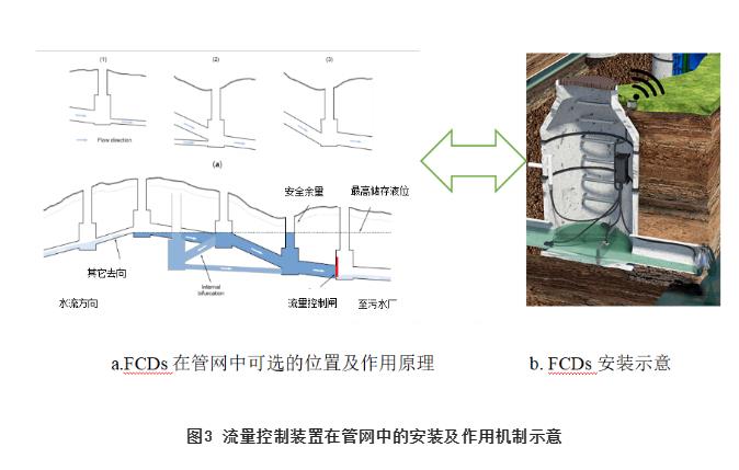 國外的研究和實際案例表明,基于整個排水系統(tǒng)的拓撲結構,結合管網(wǎng)水力模擬等手段,選擇在管網(wǎng)關鍵節(jié)點處設置流量控制設備,通過布局策略、具體安裝數(shù)量和位置優(yōu)化,可以實現(xiàn)雨季對管網(wǎng)在線調(diào)蓄能力的充分利用,并實時減少CSO及下游管網(wǎng)的流量壓力,見圖3。我國室外排水設計標準缺少在城鎮(zhèn)排水管網(wǎng)適當位置設置流量控制調(diào)節(jié)設施、設備等方面的具體技術要求或建議,因此,實際項目設計往往沒有考慮對排水系統(tǒng)流量主動控制與優(yōu)化分配的必要性,導致暴雨期間無法實現(xiàn)對整個排水管網(wǎng)不同位置或區(qū)域的下泄流量和流速的有效控制,以及短時下游管網(wǎng)承受來自上游管網(wǎng)超量的流量沖擊進而使得下游排水區(qū)域的排水不暢、內(nèi)澇及CSO等現(xiàn)象,甚至在管網(wǎng)薄弱環(huán)節(jié)出現(xiàn)突發(fā)性的滿溢和洪澇災害;同時,由于管網(wǎng)中缺乏FCDs,不能充分發(fā)揮管網(wǎng)應有的在線調(diào)蓄能力,對末端流量控制易造成瞬時沖擊和壓力。實際上,分布式的流量控制設備相對大規(guī)模灰色基礎設施建設更加經(jīng)濟、易于實施、可持續(xù),因此,改進傳統(tǒng)排水管網(wǎng)被動接收的排水模式,通過設置必要的在線流量控制裝置實現(xiàn)排水系統(tǒng)峰值流量管控,向“空間”換“時間”的主動控制方向轉變,對于增加汛期排洪防澇的靈活性、提升排水系統(tǒng)韌性和可靠性等方面至關重要。
