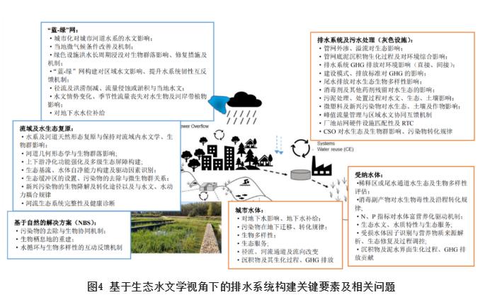 傳統(tǒng)城市排水系統(tǒng)的規(guī)劃、設計與實施環(huán)節(jié)可歸結為“水量”和“水質”兩個維度,缺乏跨學科性且統(tǒng)籌不足,因此在規(guī)劃設計中融入生態(tài)水文措施可以彌補傳統(tǒng)排水設施的剛性缺欠。近年來,在“海綿城市”理念引領下,一些基于自然的解決方案(Nature-based solutions ,NBS) 得到應用。盡管NBS是為特定目的而設計的(如城市排水),但它可以同時提供多種生態(tài)系統(tǒng)服務,如雨水自然處理和滲濾、蒸發(fā)和生物多樣性保持等。通過對近些年的一些實踐案例調(diào)研發(fā)現(xiàn),個別具有“生態(tài)”特征的綠色基礎設施項目,從“現(xiàn)代生態(tài)水文學”角度來評價,則會發(fā)現(xiàn)其在城市水文、生物多樣性及水生態(tài)服務等維度上缺乏系統(tǒng)性統(tǒng)籌,因此,應從排水系統(tǒng)或者全域水資源系統(tǒng)管理角度,充分考慮水的社會循環(huán)擾動對自然水文及生物多樣性的影響。城市級流域尺度上水系統(tǒng)不同要素之間的關聯(lián)及相互作用關系見圖4。
