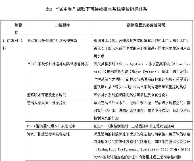 基于上述分析,“碳中和”格局下隨著氣候變化影響下不確定性天氣日益增加,水系統(tǒng)作為市政基礎設施要成為韌性城市總體規(guī)劃的重要組成部分,也要主動適應不斷變化的外在環(huán)境壓力及相關條件的約束而不斷調(diào)整和優(yōu)化框架、技術和管理體系;從另一角度看,低碳既是水系統(tǒng)面臨的壓力,更是給水務和環(huán)境行業(yè)帶來了新的技術發(fā)展驅動力、商業(yè)模式創(chuàng)新和發(fā)展機遇。水務行業(yè)要系統(tǒng)性構建以韌性、可靠性與可持續(xù)性為基本特征的面向未來的城鎮(zhèn)排水系統(tǒng)框架,至關重要的問題是,可持續(xù)城市排水系統(tǒng)構建需要跨學科、跨部門的協(xié)作和共同實踐,問題在于所涉及的社會和技術復雜性,以及對水系統(tǒng)面臨的綜合挑戰(zhàn)和系統(tǒng)解決方案的范圍缺乏共同的理解和認知,推進可持續(xù)排水系統(tǒng)的構建不是一件容易的事情。目前,國內(nèi)外尚缺乏“碳中和”戰(zhàn)略下可持續(xù)排水系統(tǒng)評價指標體系,為此將系統(tǒng)可靠性、韌性、低碳、生態(tài)安全性、智慧監(jiān)測與控制及非工程性措施與利益相關方的積極參與六個維度設置為一級指標,在一級指標基礎上細化為47項二級指標,具體見表2。需要說明的是,不同指標之間可能會存在一些內(nèi)在的邏輯關系和相互影響,但是排水系統(tǒng)本身就是一個多維度、多層次、多因素、多目標復雜交織的體系,需要各個專業(yè)的共同協(xié)作和推進。
