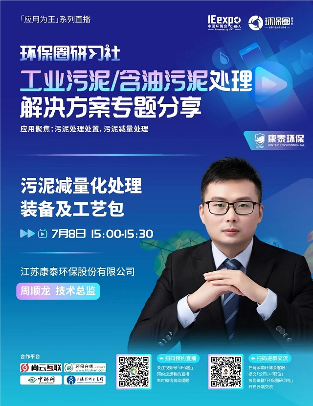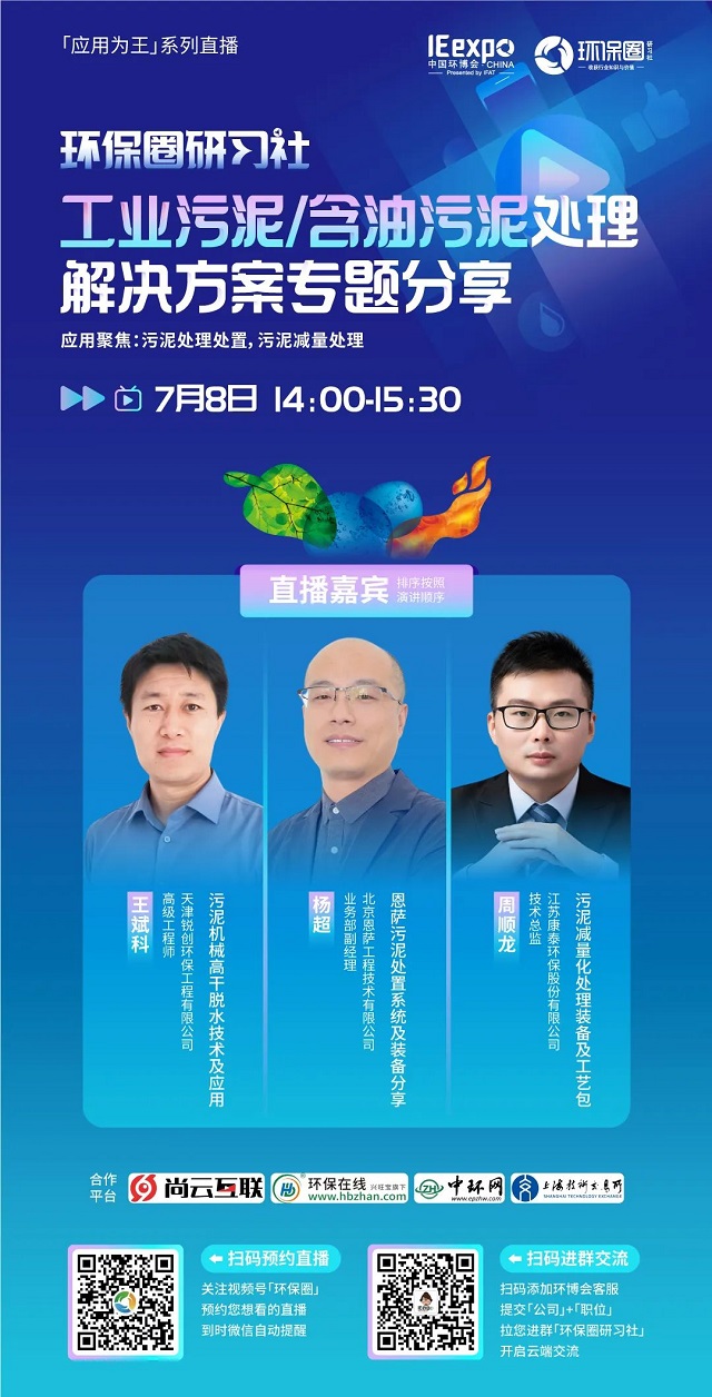 7月8日(星期五)下午14:00-15:30,環保圈研習社“應用為王”系列直播工業污泥/含油污泥處理解決方案專題分享,有幸邀請到了銳創環保、北京恩薩、江蘇康泰環保3家企業的技術專家做客直播間,聚焦工業污泥/含油污泥處理,為大家分享污泥處理處置,污泥減量處理解決方案。