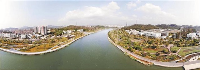 經過整治的茅洲河水質清澈、兩岸水清岸綠。