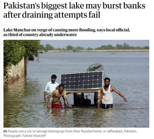 報道稱,為避免造成更大損害,政府官員們已于周日(當地時間9月4日)對曼查爾湖采取泄洪措施。他們表示,雖然此舉可能會使10萬人被迫離開家園,但同時也會讓人口更稠密的地區免遭洪水侵襲。