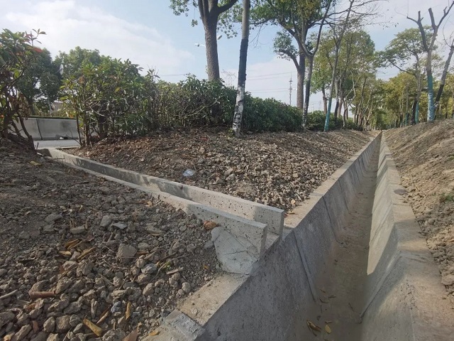 在趙重公路新豐支路至滬常高速段,由于道路兩側地塊標高較高,排水溝淤堵、填埋導致雨天經常出現內澇情況。針對該路段積水原因,改造工程重點解決路面積水匯流及排水出路問題,在非機動車道外側新建流水槽,將非機動車道外側積水引流至道路外側,翻挖新建邊溝、雨水連通管和雨水口,實現及時排水。“之前道路設計是自排水的,依靠道路兩側的土溝收集雨水,隨著這幾年道路周邊地塊開發,土溝已經不滿足排水要求,所以按照五年一遇的暴雨降水量,在道路兩側增設混凝土明溝收集道路雨水,現在施工已經完成,觀察下來,道路沒有發生過積水問題。”青浦區道路運輸管理事務中心工作人員徐華介紹。