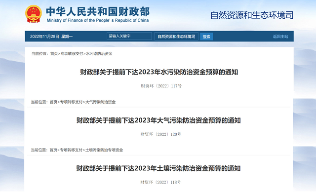 今年,來得最早的是水、土、氣3大污染防治和農村環境整治資金。11月8日,財政部發布《關于提前下達2023年水污染防治資金預算的通知》、《關于提前下達2023年大氣污染防治資金預算的通知》、《關于提前下達2023年土壤污染防治資金預算的通知》和《關于提前下達2023年農村環境整治資金預算的通知》,對上述4項資金做出了安排。