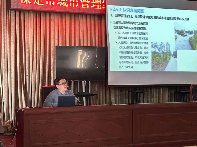 接著,馬洪濤教授針對規(guī)劃是基礎(chǔ),構(gòu)建全面科學(xué)的海綿城市規(guī)劃體系;方案是指引,編制合理系統(tǒng)的海綿城市實施方案;項目是根本,做好科學(xué)合理的海綿城市設(shè)計方案;機(jī)制是基礎(chǔ),構(gòu)建完整可行的海綿城市推進(jìn)機(jī)制;模式是保障,選擇綜合統(tǒng)籌的海綿城市建設(shè)模式;交流是助力,形成通俗易懂的海綿城市語言體系等方面,結(jié)合其他城市建設(shè)經(jīng)驗,針對保定實際,做了深入淺出、通俗易懂的細(xì)致講解。