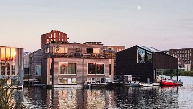 過去幾年,“漂浮住宅”的理念也逐漸興起。在阿姆斯特丹北部的斯孔奇普社區,Space&Matter建筑公司設計了30座水上住宅。項目于2021年竣工,目前已吸引了100多位住戶。
