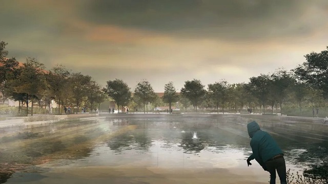 這座公園坐落在山腳下,它的改造基于增設蓄水空間的想法?;炷燎髑驁霰唤档土?m,變成了蓄洪空間。當球場蓄滿水后,雨水會流向下沉式的玫瑰花園,最終匯入湖中。公園中還計劃建造可調蓄雨洪的洼地。拉夫恩還提到,公園圍墻的建造能夠有效防止雨水外流,同時通過巧妙的設計,也可避免場地中的古樹移植。