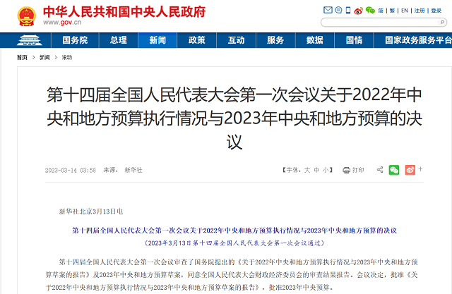 2023年3月13日,第十四屆全國人民代表大會第一次會議審查了國務院提出的《關于2022年中央和地方預算執行情況與2023年中央和地方預算草案的報告》及2023年中央和地方預算草案,同意全國人民代表大會財政經濟委員會的審查結果報告。會議決定,批準《關于2022年中央和地方預算執行情況與2023年中央和地方預算草案的報告》,批準2023年中央預算。