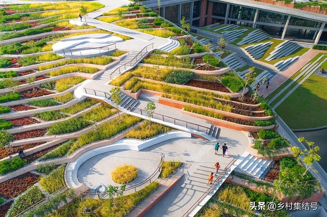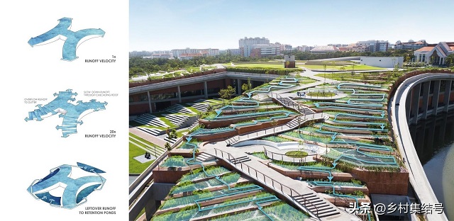 當(dāng)雨水擊中屋頂時(shí),首先農(nóng)作物的種植加強(qiáng)了土壤的肥沃度,減少了雨水期間的水土流失,并有效防止污染徑流和空氣中的毒素從排水系統(tǒng)和自然水體中進(jìn)入。多余的雨水會沿著斜坡蜿蜒而下,下一層梯田就會收集上一層的徑流,所到之處會形成獨(dú)特的小分水嶺群,幫助吸收、過濾和凈化雨水。