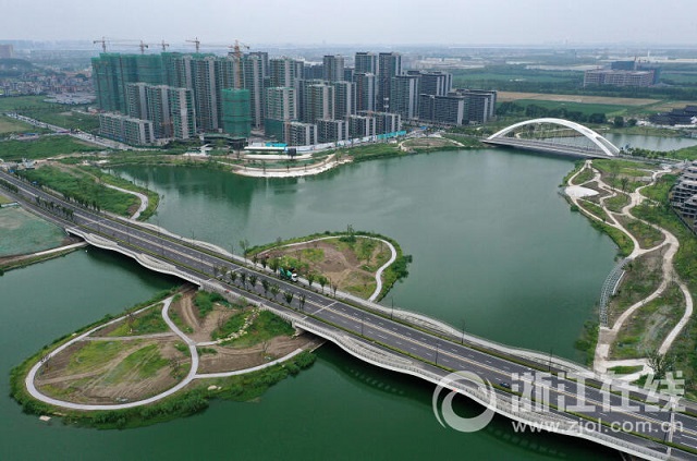 近年來,杭州進一步加大海綿城市建設力度。本組圖片為8月15日記者用無人機鳥瞰杭州錢塘區東湖防洪調蓄湖配套工程一期,其北岸的濱水空間“樣板段”已基本完工。該項目水域面積約34.5萬平方米,陸域面積約29.72萬平方米,涵蓋綠地面積約21.8萬平方米。公園以生態建設為核心,用多種植物打造水上森林、浩瀚蘆葦灘等特色景觀,延續生態野趣的濕地風貌,具備水質涵養及氣候調節等生態功能。