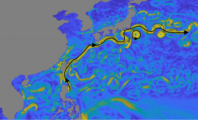 北太平洋環流的主要結構為一個順時針環流,在福島附近起主導作用的是黑潮(著名洋流,因??深藍似???得名),黑潮在離開日本后,主要向東流動,所以核污染水的主要擴散方向是向東。