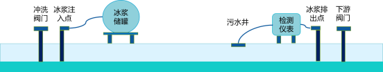 冰漿清洗技術(shù)是將冰漿加注進(jìn)管道內(nèi),使冰漿在管道內(nèi)形成一段柔軟的“冰活塞”,再利用市政管道上游水壓推動(dòng)“冰活塞”向前移動(dòng),在移動(dòng)時(shí)冰漿與管道內(nèi)壁發(fā)生碰撞及摩擦,使管底沉積物與管壁附著物的穩(wěn)定結(jié)構(gòu)遭到破壞,從而剝離管壁并隨著冰漿一起向前移動(dòng)直至排出管道,最終達(dá)到清洗管道的目的。