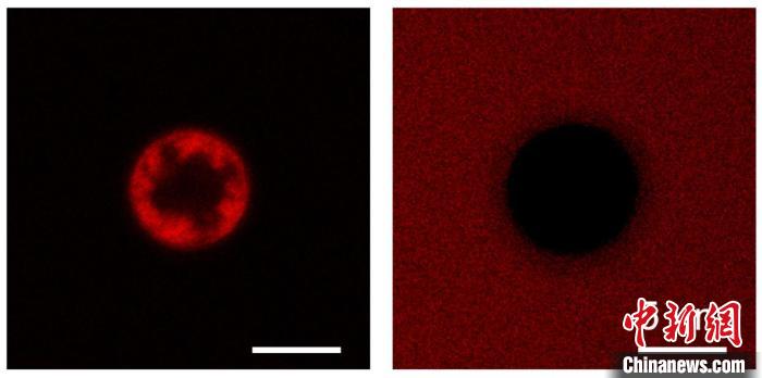 左圖:微球從廢水中捕獲染料的熒光顯微圖像;右圖:微球在有機(jī)溶劑中釋放染料的熒光顯微圖像。中國(guó)科學(xué)院理化所供圖