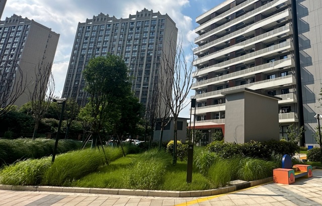 項目還采用分散設置的下凹綠地、雨水花園,消納周邊雨水,并應用淺層調蓄設施,構建雨水快速導入、自然凈化、復合利用的海綿系統(tǒng)。