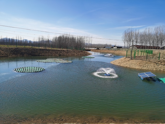 在泗水縣青龍莊村南側,有一處自然坑塘,水體顏色異常且透明度低于20CM,經排查確認為農村黑臭水體。當地投入36萬元,采取排除污水、清除底泥、草皮護坡、清理坑塘周邊垃圾等措施,治理坑塘面積約4300平方米,汛期可集蓄1.2萬余方雨水,為周邊農田提供9000余方灌溉水源。此外,還在水面安裝了太陽能曝氣機及生態浮島,維持水體凈化能力。