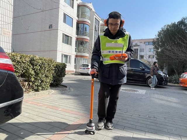聽漏儀是一根長(zhǎng)長(zhǎng)的“聽筒”,如同靈敏的“順風(fēng)耳”,工作人員戴上耳機(jī),將“聽筒”貼向地面,每邁一步便挪動(dòng)一次聽漏儀的位置,就這樣一點(diǎn)點(diǎn)探查管道的“健康”狀況。