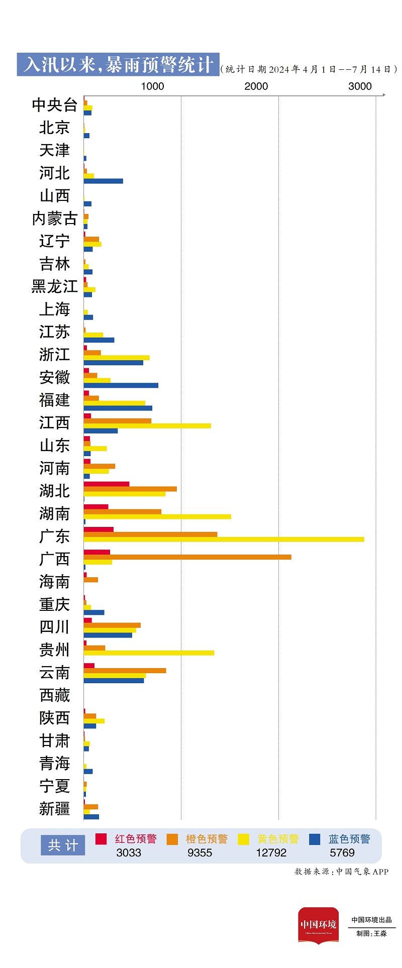 單月暴雨紅色預警同比增加61.1% 梳理發現,4月1日入汛以來,全國發布氣象預警信息16萬條,其中暴雨預警氣象災害預警信息達到3萬余條,占比18.83%。據統計,截止7月14日,中央氣象臺共計發布暴雨紅色預警9次。從全國情況來看,廣東發布暴雨預警信息4569條,湖北發布暴雨紅色預警信息多達470條。