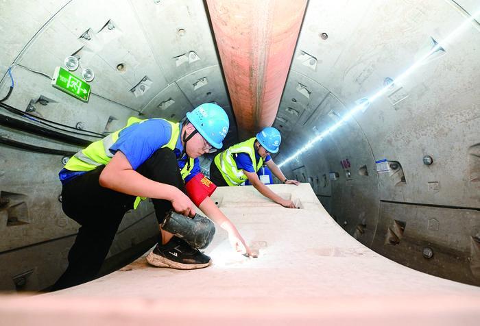近日,天津市濱海新區雨污分流改造工程項目雨水主管隧道順利貫通,為項目完工打下堅實基礎。據介紹,項目建成后,區域內雨水和污水將“各行其道”,有利于提升市政道路排水能力,暢通城市排水管網,緩解汛期城市內澇問題。圖為工作人員在雨水主管隧道內檢查盾構管片。