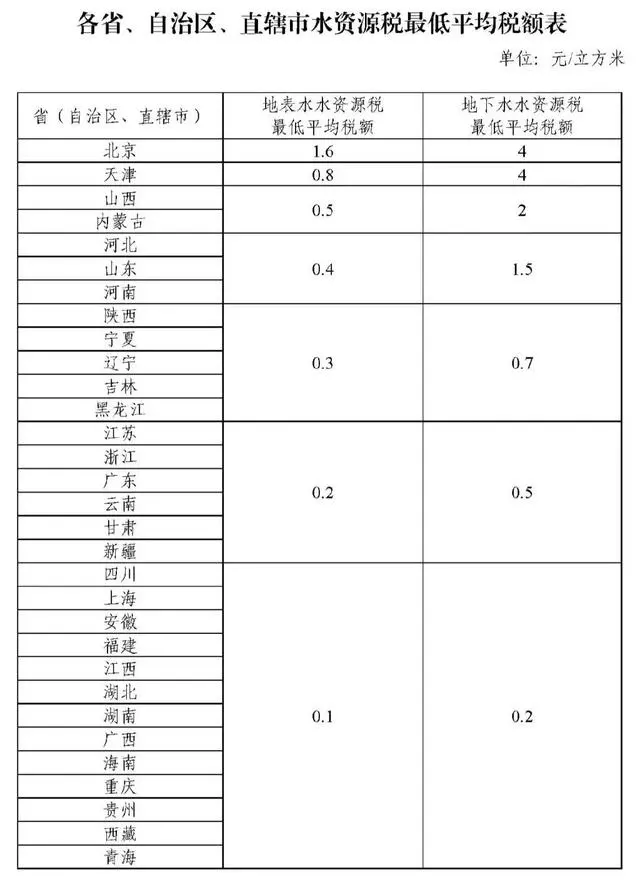 附:各省、自治區、直轄市水資源稅最低平均稅額表