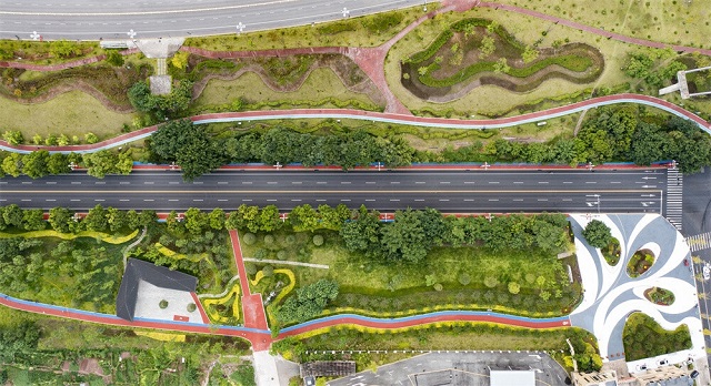 而今,大家口中的“濺水路”,在海綿城市建設中得以“翻新”“走紅”。從無人機視角俯瞰,現在的會展街好似一條“彩虹路”,車輛雙向四車道上通行有序,行人在五彩游步道上觀美景、嗅花香。