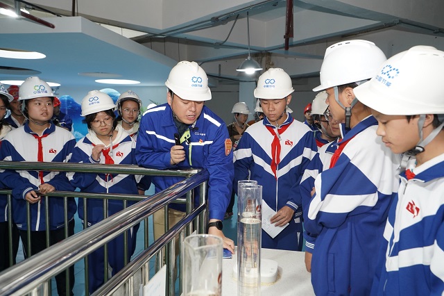 深入地下五層來(lái)到再生水廠,猶如走進(jìn)一座“地下迷宮”,滿(mǎn)眼盡是彎彎折折的地下廊道。學(xué)生們走進(jìn)地下水廠后,先后參觀了展廳、中控室、預(yù)處理區(qū)、生化池區(qū)、MBR膜池區(qū)和尾水池等區(qū)域,近距離觀察了其中的污水處理相關(guān)裝置,并跟隨講解員了解其中的科學(xué)原理。