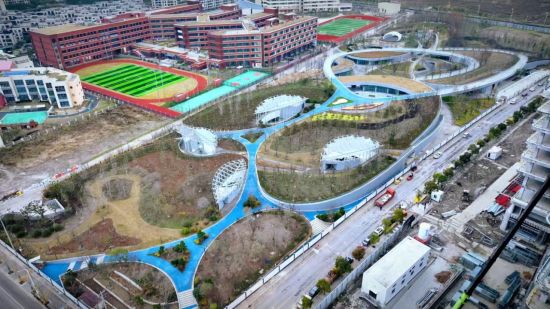 該綠地位于上海臨港滴水湖西側,北鄰洛神花路,南至雪絨花路,東至白荊路,西至云皓路,南側緊鄰規劃公交首末站。建設總用地面積約56109.4平方米,項目以“立體公園、綠色碳匯”為主題進行設計施工。巧妙利用地形起伏構建出不同高差道路,并融入周邊多個住宅小區、寫字樓以及華東師范大學附屬幼兒園、附屬中學,實現與環境的生態共聯,并為周邊各類人群提供了地上地下豎向立體的休憩空間。同時,該綠地大規模運用環保材料與精心配置的碳匯植物,打造了綠色屋頂、透水鋪裝、雨水花園等一系列先進的海綿設施,充分發揮綠地系統“滲、滯、蓄”的功能,從而達到雨水源頭“凈”的目標,將景觀功能與生態功能一體化,在確保排水防澇安全的前提下,最大限度地實現雨水的積存、滲透和凈化,促進雨水資源的利用和生態環境保護。