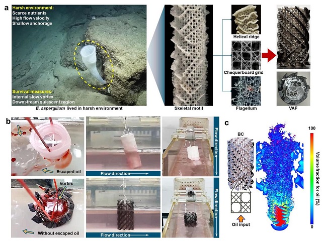 深海玻璃海綿(又稱(chēng)“維納斯花籃”)是一種在1000m水下固著生長(zhǎng)存活上萬(wàn)年的生物,在適應(yīng)惡劣環(huán)境的自然選擇過(guò)程中演化出獨(dú)特的結(jié)構(gòu),對(duì)復(fù)雜流態(tài)和貧營(yíng)養(yǎng)環(huán)境具有良好的適應(yīng)性。受這一現(xiàn)象啟發(fā),尤世界教授團(tuán)隊(duì)創(chuàng)新提出了一種仿玻璃海綿渦流錨固過(guò)濾器(VAF)并利用3D打印技術(shù)進(jìn)行重構(gòu),解析了內(nèi)棋盤(pán)網(wǎng)格+外脊螺旋復(fù)合結(jié)構(gòu)對(duì)外部湍流能量削減轉(zhuǎn)化形成內(nèi)部小尺度渦流的多物理場(chǎng)場(chǎng)協(xié)同機(jī)制,賦予了VAF卓越的流體動(dòng)力學(xué)穩(wěn)定性、高效的界面?zhèn)髻|(zhì)特性和更長(zhǎng)的內(nèi)部停留時(shí)間,實(shí)現(xiàn)了亞臨界至超臨界流態(tài)范圍內(nèi)穩(wěn)定捕集浮油、乳化油和溶解油,捕集率高于97%。該研究體現(xiàn)了環(huán)境工程、流體力學(xué)、生物物理學(xué)和仿生學(xué)的深度交叉融合,為解決復(fù)雜水動(dòng)力環(huán)境下的油類(lèi)污染原位捕集和水環(huán)境修復(fù)提供了全新的思路和方法。