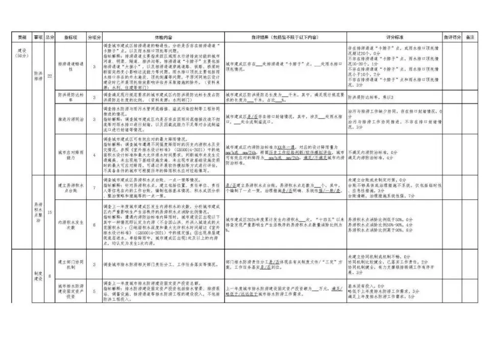 為深入貫徹落實(shí)黨中央、國(guó)務(wù)院決策部署,建立城市內(nèi)澇治理評(píng)估機(jī)制,我們?cè)?024年組織開(kāi)展城市排水防澇專(zhuān)項(xiàng)體檢自評(píng)估的基礎(chǔ)上,研究更新了《城市排水防澇專(zhuān)項(xiàng)體檢指標(biāo)表(2025年)》(見(jiàn)附件,以下簡(jiǎn)稱(chēng)“指標(biāo)表”),現(xiàn)印發(fā)給你們。請(qǐng)你們結(jié)合2025年汛前準(zhǔn)備、隱患排查等工作,組織開(kāi)展城市排水防澇專(zhuān)項(xiàng)體檢自評(píng)估,全面排查城市防洪排澇體系的問(wèn)題短板和薄弱環(huán)節(jié)。專(zhuān)項(xiàng)體檢要覆蓋全部城市(包括地級(jí)及以上城市、縣級(jí)市,不含下轄縣、鄉(xiāng)、鎮(zhèn))。針對(duì)體檢發(fā)現(xiàn)的問(wèn)題,屬于本部門(mén)的,要明確措施和整改時(shí)限,持續(xù)推進(jìn)解決;需要相關(guān)部門(mén)解決的,城市建設(shè)(排水)部門(mén)要報(bào)告屬地政府,及時(shí)反饋和移交。
