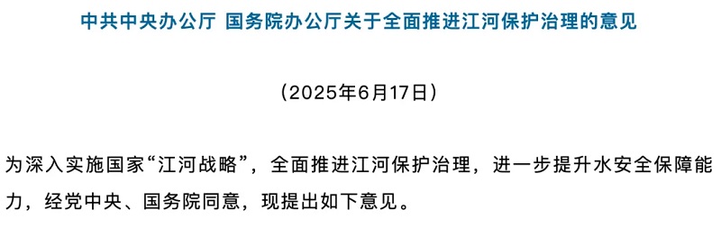 首次明確將流域綜合治理 提升至國(guó)家戰(zhàn)略高度 2025年6月17日,《中共中央辦公廳國(guó)務(wù)院辦公廳關(guān)于全面推進(jìn)江河保護(hù)治理的意見(jiàn)》(以下簡(jiǎn)稱(chēng)《意見(jiàn)》)正式發(fā)布。