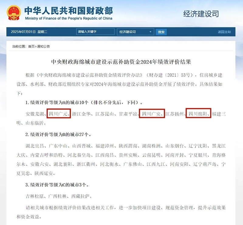根據(jù)《中央財政海綿城市建設示范補助資金績效評價辦法》,住房城鄉(xiāng)建設部、水利部、財政部近期組織專家對2024年海綿城市建設示范補助資金開展了績效評價。評價結果顯示,共有10個城市績效評價等級為A,其中包括廣元市、廣安市、綿陽市等3個四川城市。