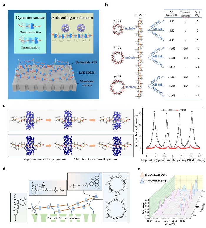 針對上述問題,團隊提出使用超分子而非高分子在水處理膜表面構(gòu)建抗污染層的策略。超分子為由聚二甲基硅氧烷(PDMS)和環(huán)糊精(CD)組成的聚輪烷。PDMS為低表面能線性大分子,CD是親水環(huán)狀小分子,CD-PDMS聚輪烷呈線穿環(huán)結(jié)構(gòu)。CD可沿PDMS鏈滑動、旋轉(zhuǎn)和振動,形成相對動態(tài)親水-低表面能非均相微區(qū)。這一結(jié)構(gòu)可使污染物與膜表面的接觸不穩(wěn)定,輔以CD的布朗運動,能夠在低切向流,甚至靜態(tài)條件下有效驅(qū)除膜表面污染物。此外,還可防止低表面能組分團聚,并通過氫鍵作用攜帶并促進水分子傳輸。