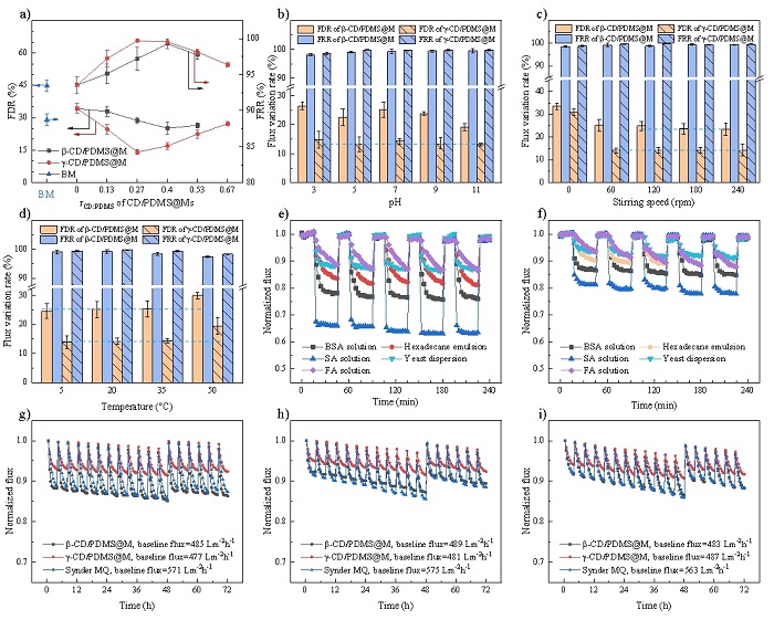 研究成果揭示了CD類型、CD/PDMS摩爾比-CD/PDMS聚輪烷動態(tài)性-膜綜合性能間的級聯(lián)關(guān)系,確定了最佳抗污染層結(jié)構(gòu)。因γ-CD空腔大、柔性強,γ-CD/PDMS聚輪烷的動態(tài)性優(yōu)于β-CD/PDMS聚輪烷。當(dāng)CD和PDMS鏈節(jié)數(shù)量比為0.27~0.40時(CD完全覆蓋PDMS時該值為0.67),CD/PDMS聚輪烷動態(tài)性最強,此時單個CD動態(tài)性和CD數(shù)量的乘積最大。實驗結(jié)果表明,膜綜合性能在超分子抗污染層動態(tài)性最強時達(dá)到最高值,20℃下滲透通量500 LMH·bar-1,過濾BSA溶液通量衰減率14.2%,恢復(fù)率99.7%,且優(yōu)秀抗污染效果普適于酵母菌、腐植酸、海藻酸鈉、乳化油等多種污染物,在松花江水、市政污水和魯奇爐煤氣化污水等實際水體的72小時錯流實驗中,也表現(xiàn)出了優(yōu)越的穩(wěn)定性,每個反洗周期(4小時)中衰減率僅為3%-7%,化學(xué)清洗后通量恢復(fù)率接近100%。反證實驗表明了超分子動態(tài)性是膜通量提升的關(guān)鍵因素,基于AFM的作用力測定和微量吸附實驗進一步證明了超分子動態(tài)性在膜抗污染能力強化方面的多重作用。團隊通過實驗和理論的相互驗證,為水處理膜抗污染能力強化提供了更多策略。