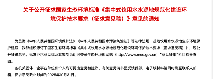 為貫徹《中華人民共和國環境保護法》《中華人民共和國水污染防治法》,規范飲用水水源地生態環境保護建設,提升水源水質安全保障水平,生態環境部日前發布通知,就《集中式飲用水水源地規范化建設環境保護技術要求(征求意見稿)》(以下簡稱《征求意見稿》)公開征求社會各界意見,意見反饋截止日期為2025年10月31日。